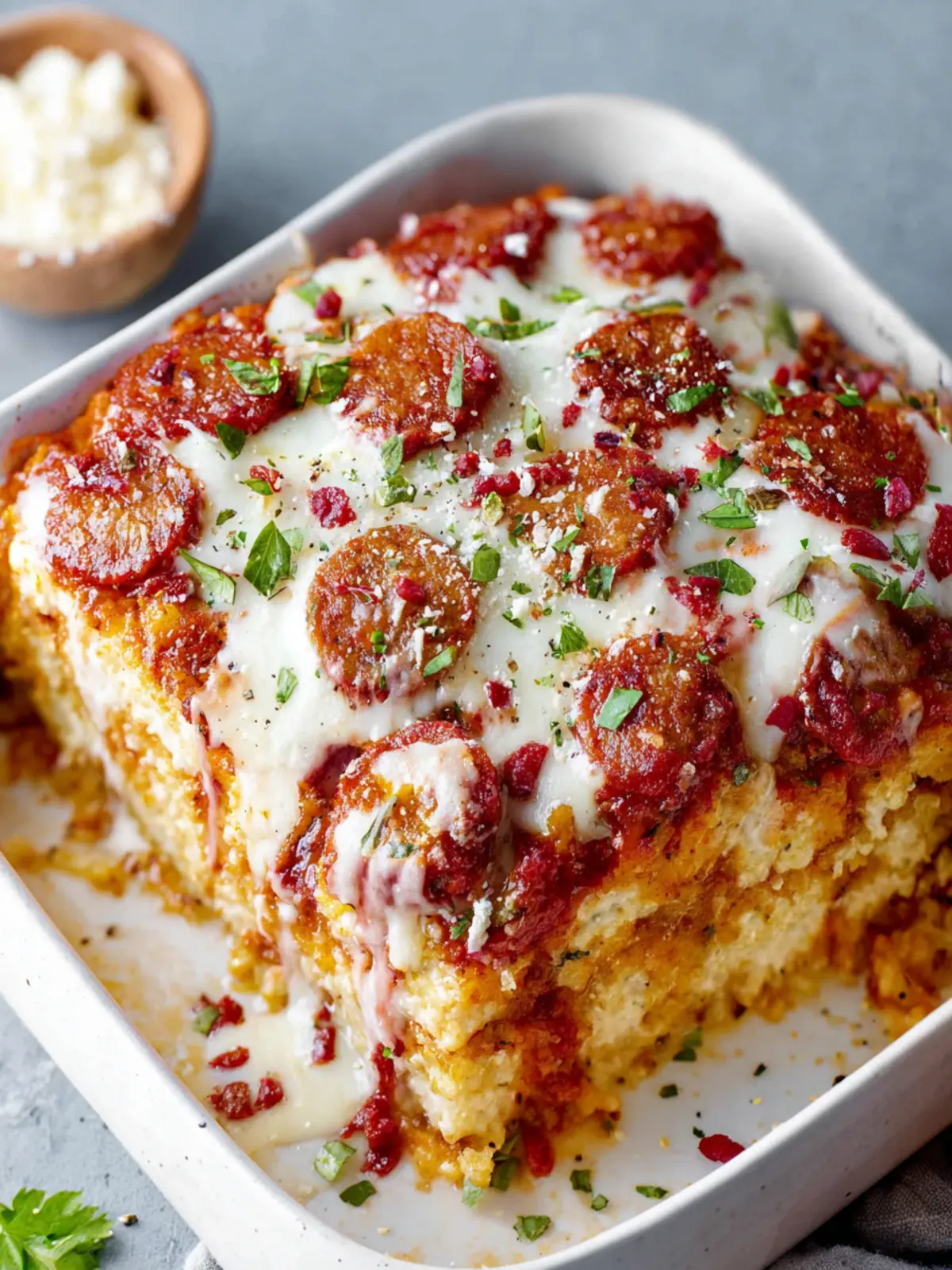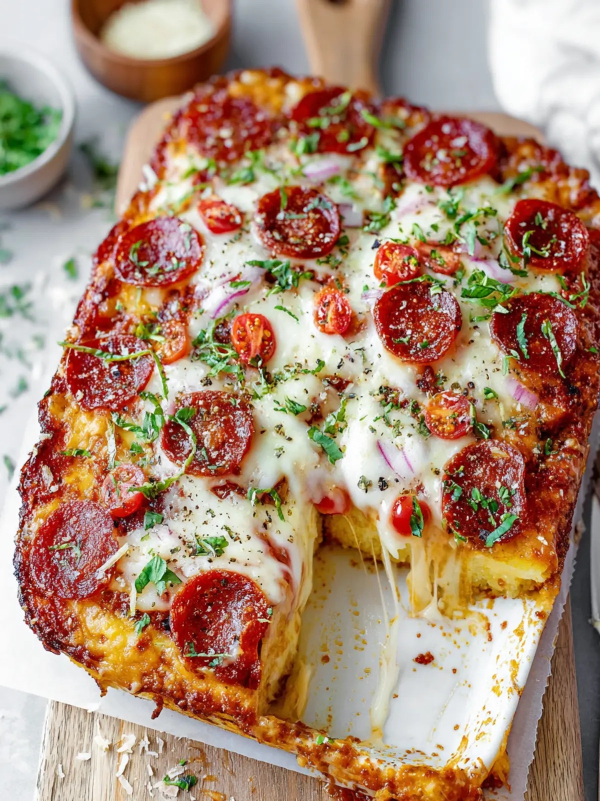 Pepperoni: For that classic pizza flavor, sliced pepperoni elevates the dish, providing a savory kick. You can easily substitute with turkey pepperoni or veggie toppings if preferred.