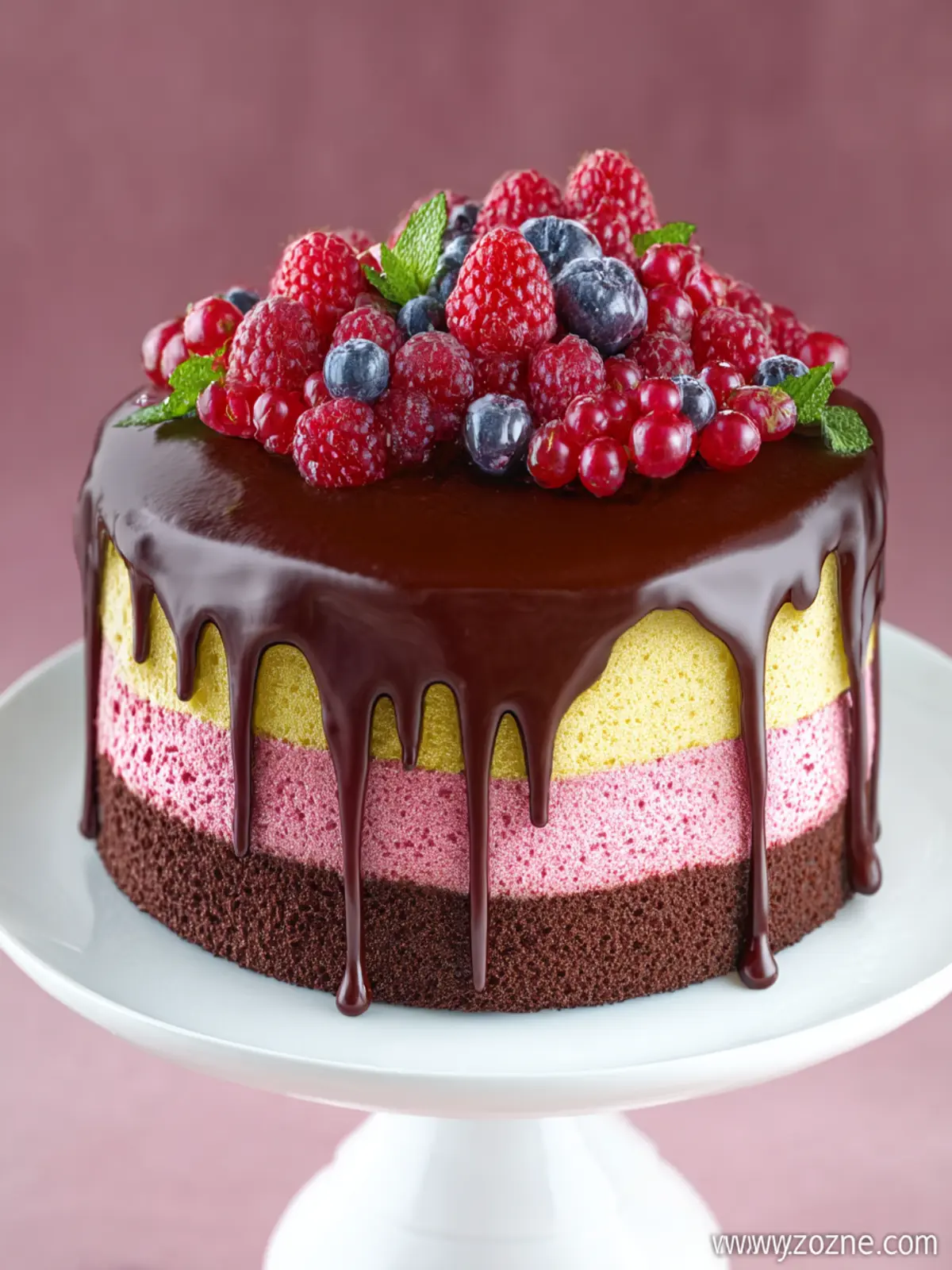A delicious raspberry mousse cake layered with chocolate ganache.