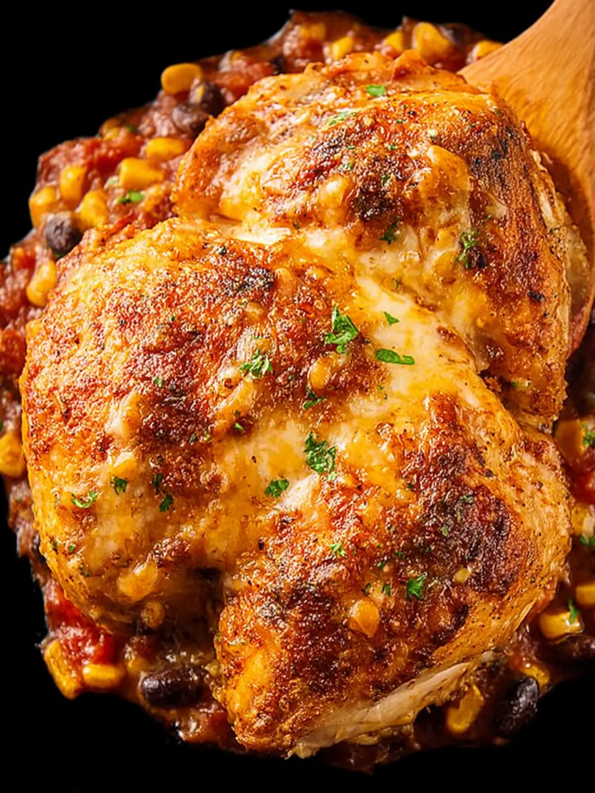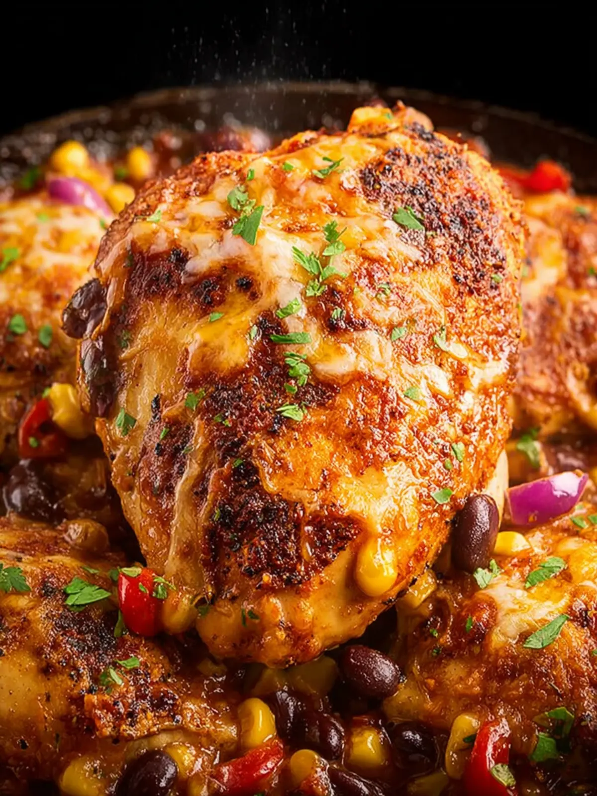 - Add the drained black beans, drained corn, and diced tomatoes to the skillet. Stir until well combined. Arrange the chicken breast over the tomato mixture in a single layer, pouring over any chicken resting juices.