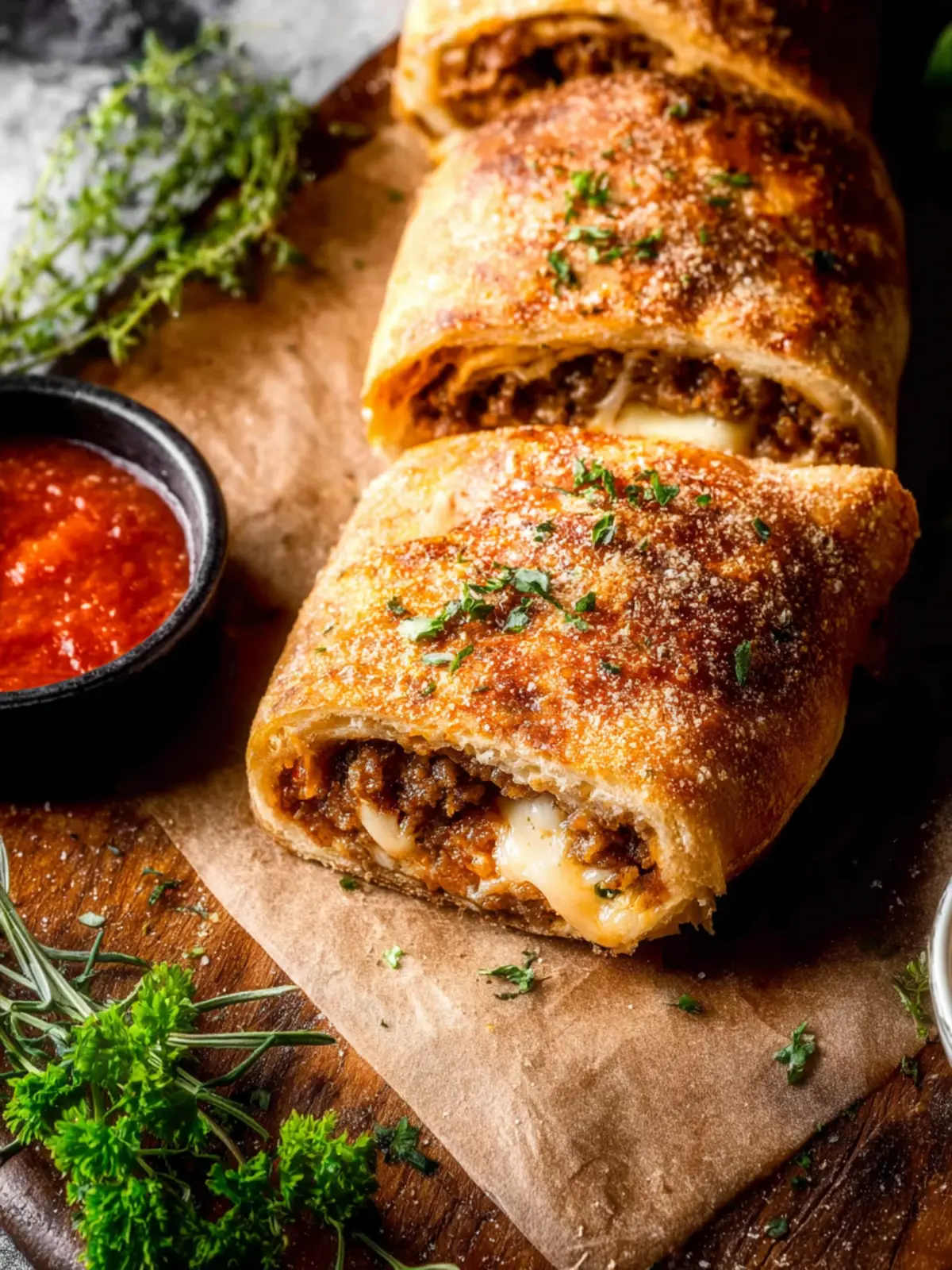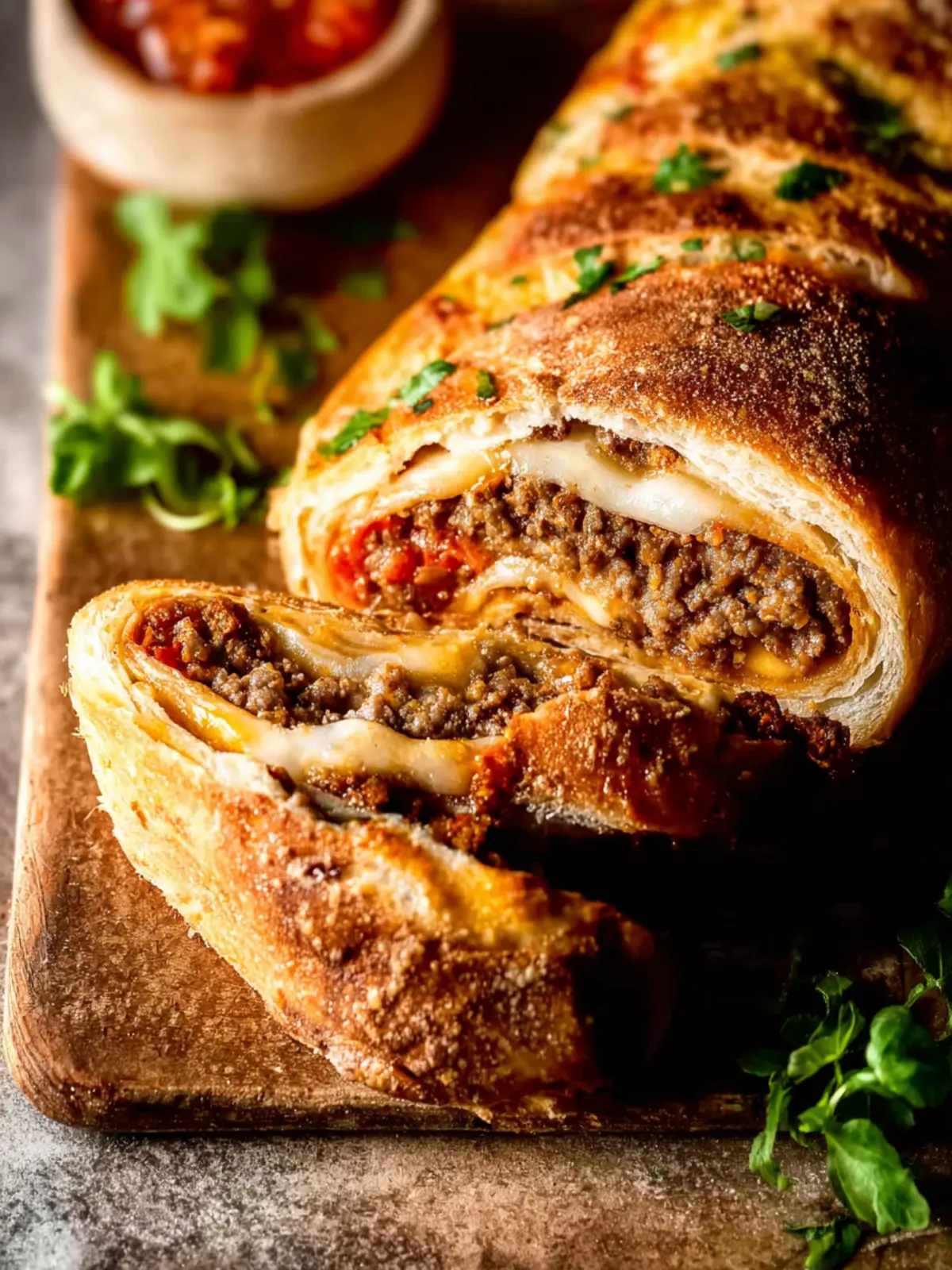 A delicious stromboli filled with ground beef and mozzarella cheese.