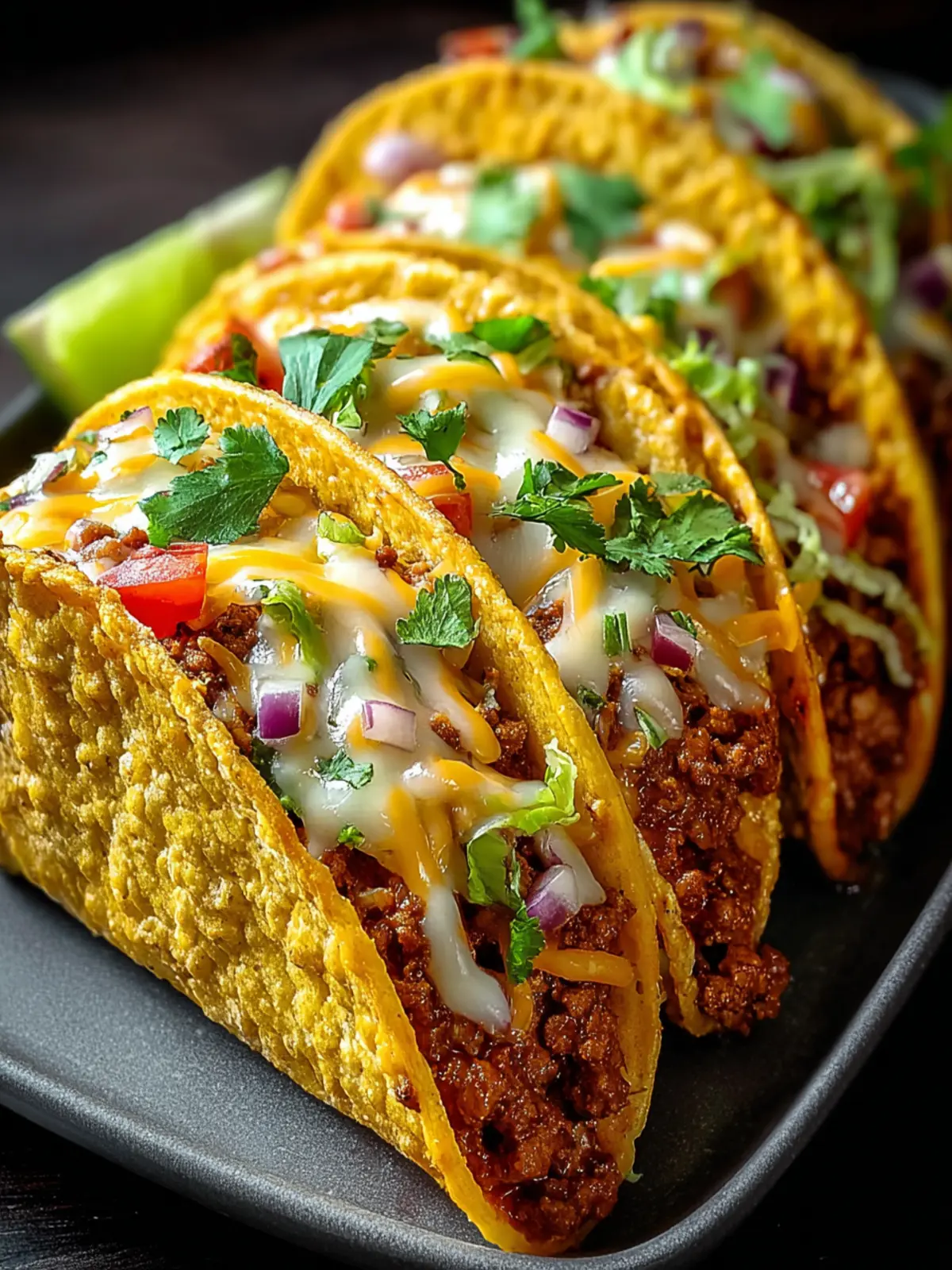 The tantalizing filling starts with your choice of seasoned ground meat or a vegetarian substitute, seasoned to perfection with spices that pack a punch. The crisp taco shells are not just vessels; they become beautifully golden and crunchy as they bake, creating that satisfying experience with each bite. Complemented by a variety of colorful toppings—from fresh avocados and vibrant pico de gallo to dollops of cool sour cream—this dish invites you to get creative and customize your meal.