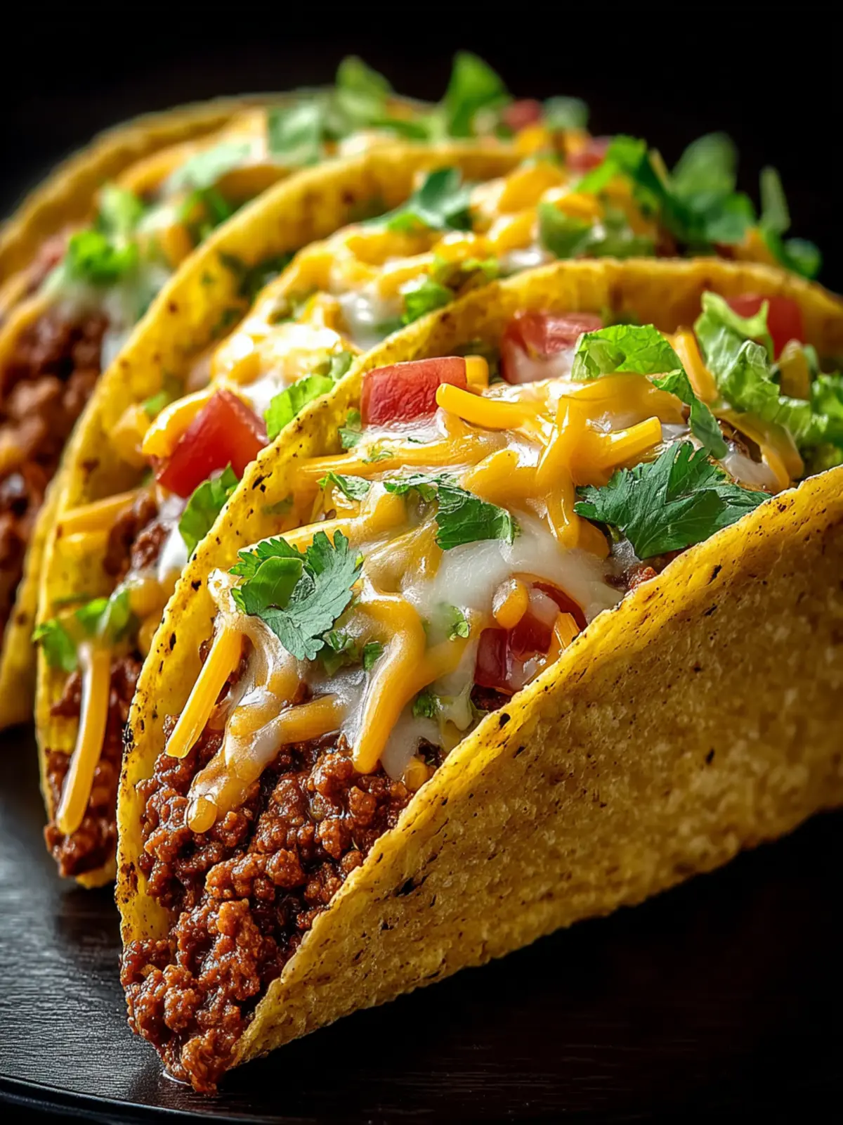 Delicious crispy taco shells filled with seasoned ground meat and topped with cheese.