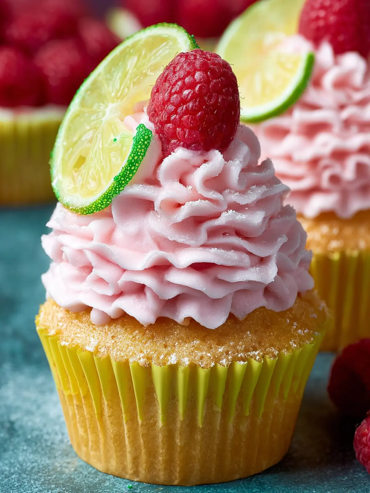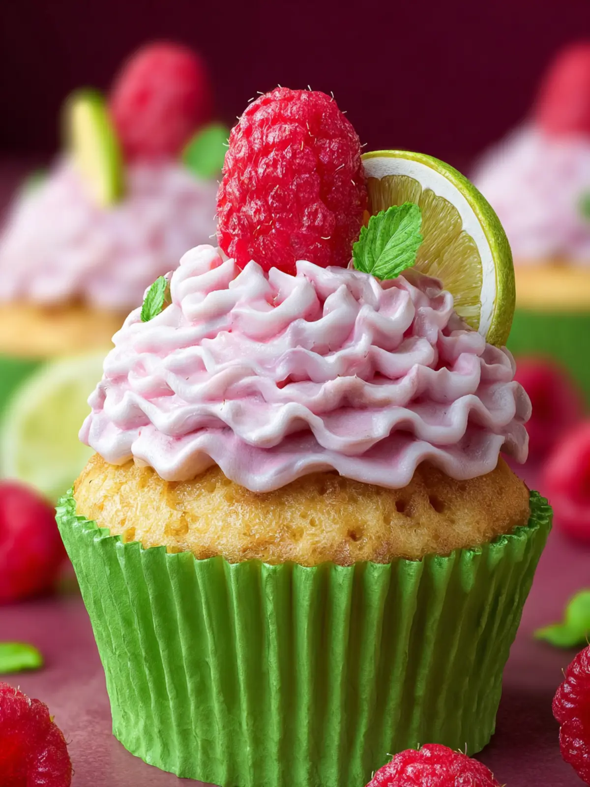 Delicious lime raspberry cupcakes topped with a creamy frosting.