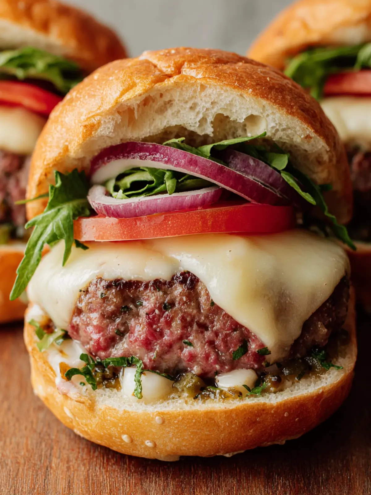 Delicious stuffed burgers filled with olives, cheese, and more.