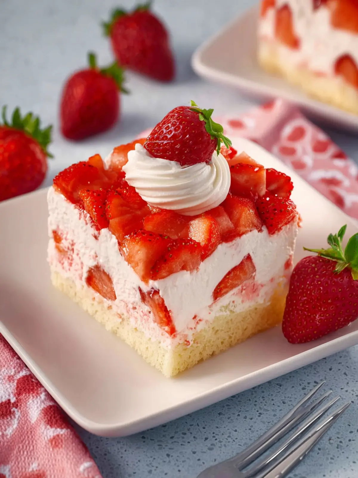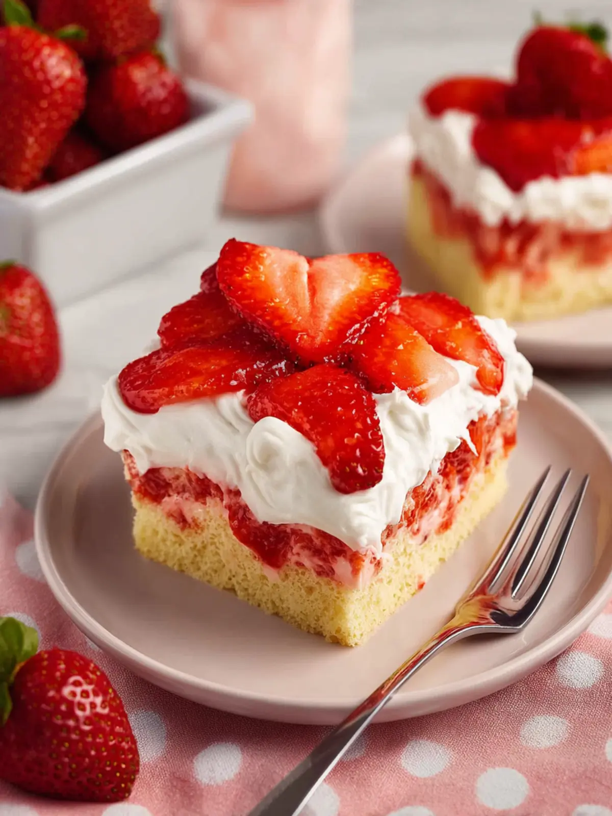 Whipped Topping: A light layer of whipped topping adds a creamy finish to this strawberry poke cake, balancing the flavors perfectly and giving it an inviting look.