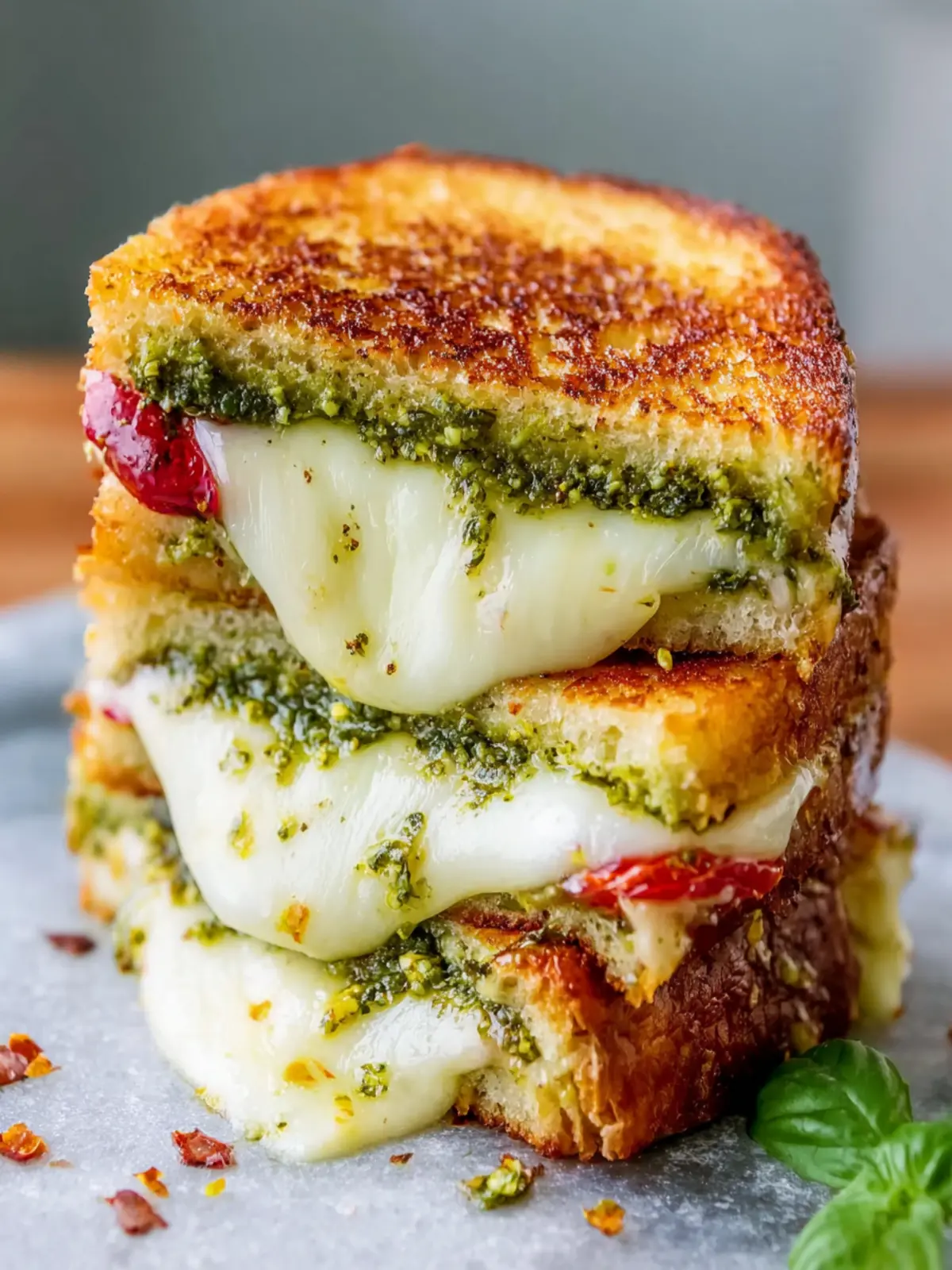 A delicious and cheesy grilled sandwich made with fresh basil pesto and three types of cheese.